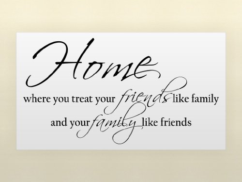 Detail of HOME WHERE YOU TREAT YOUR FRIENDS LIKE FAMILY AND YOUR FAMILY LIKE FRIENDS Vinyl wall lettering stickers quotes and sayings home art decor decalWall quotes are one of the latest trends in home decor. This new fashion is the perfect way to express yourself or add that little extra touch to a room without breaking the bank. Vinyl wall quotes give the look of a hand-painted word, quote, or saying without the cost, time, and permanent paint on your wall. They are easy to apply and can be easily removed without damaging your walls. Our quotes can be applied to walls, doors, windows, or any other solid, smooth or semi-textured surface.